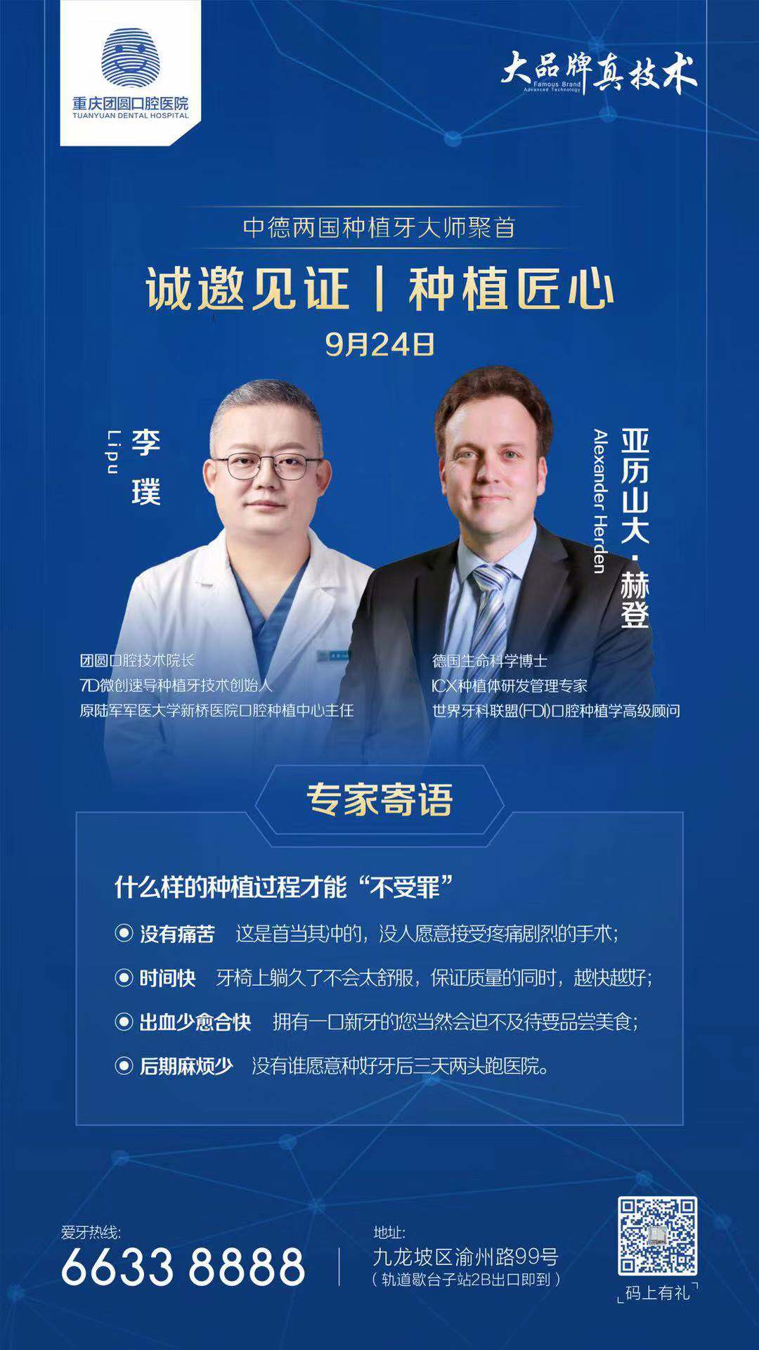 种植牙发展的每个里程碑,无不折射着当时的科技创新,在科技创新的护航下,口腔医疗正在朝越来越高效、越来越舒适、越来越美观的方向发展,为加速种植牙临床诊疗技术升级,加强学术交流,促进学科建设,加快口腔医疗技术与先进理念的国际接轨,更好地解决重庆市民看口腔名医难,看口腔疑难杂症难等问题,帮助更多缺牙人士早日落齿重生,9月24日,重庆团圆口腔医院特邀德国口腔种植学科专家莅临我院与李璞院长开展一场别开生面的种植研讨会,为山城市民带来一场匠心联袂的高级别种植牙诊疗,助力全民口腔健康事业建设。